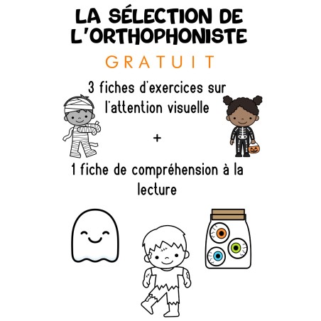 ● Quatre fiches gratuites sur le thème d'Halloween qui reposent sur le travail de l'attention visuelle et la lecture compréhension à partir de belles illustrations protégées.